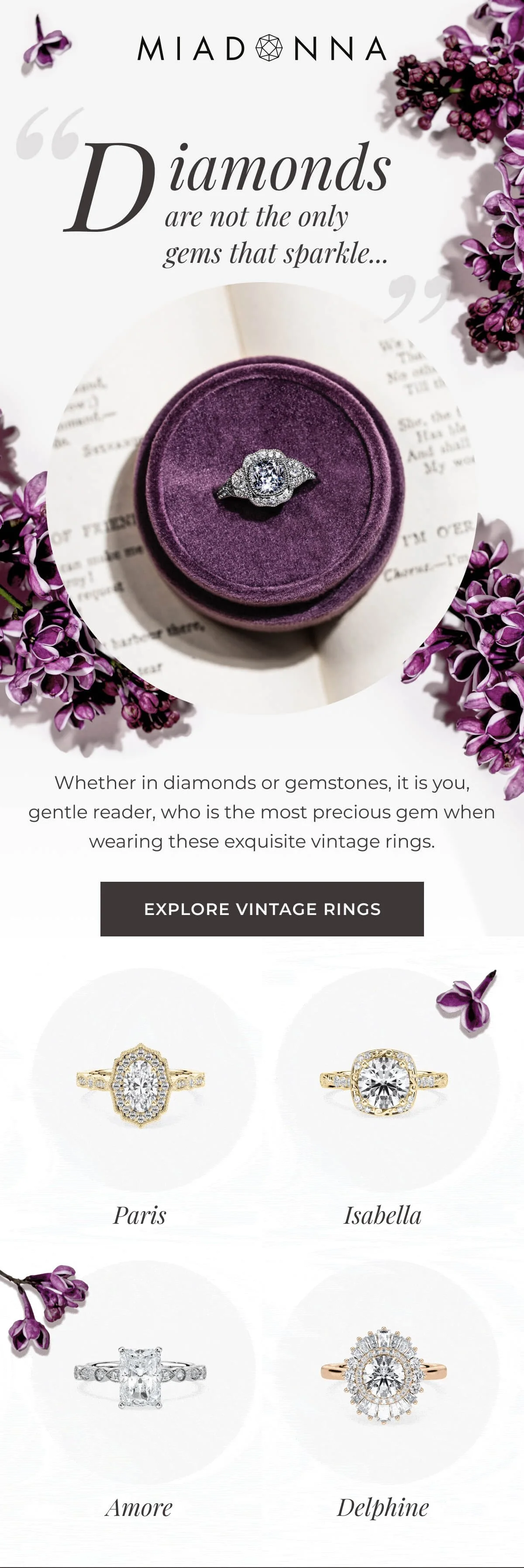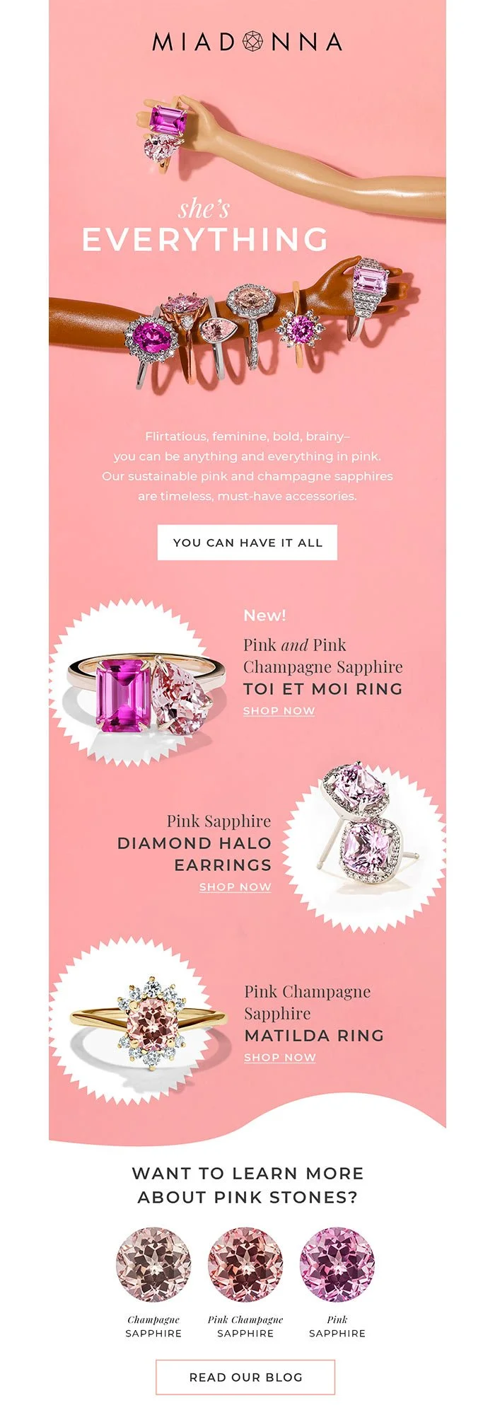 To celebrate the summer's biggest film, I developed the Barbiecore campaign, highlighting MiaDonna’s lab-grown pink sapphire jewelry. We intentionally subverted the brand's more muted color palette to honor the riot of rosy hues found in their lab-grown pink sapphires. In combination with bold colors and graphics, we created eye-catching, vibrant assets that made the product pop.